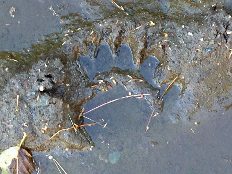 Wir suchten nach Anzeichen menschlicher Aktivitäten. Ein viel benutzter Pfad mit rosa Bändern markiert, führte uns zum Köderplatz eines Jägers. Dort waren noch Reste des Köders und Äste, die den Köder in einer Vertiefung bedeckten. Neben dieser Stelle war Bären Kot. Das Zeichen das den Jäger oder Führer identifiziert hätte, wurde entfernt und der Platz wird nicht mehr benutzt. Die meisten Köder wurden vor dem jüngsten Regen entfernt, doch es war genug stinkender Köder in der Vertiefung, der bestätigte, dass dieser Ort in diesem Herbst dafür benutzt wurde. Etwas 15 Yards entfernt waren die unteren Zweige einer Roten Kiefer entfernt worden, was bewies, dass das der Baum war, an dem der Jägerstand war. Frische Furchen in dem Baumstamm zeigten wo der Jäger 15-20 Fuß hochgeklettert war. Alles deutet auf einen Jäger hin, der diesen deutlich markierten besenderten Bären, die Halbschwester von Lily und Tochter von June schoss.