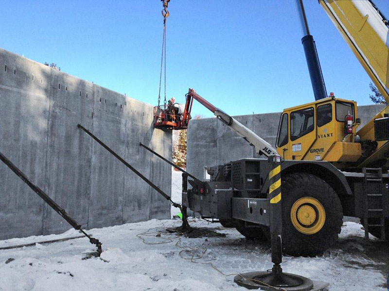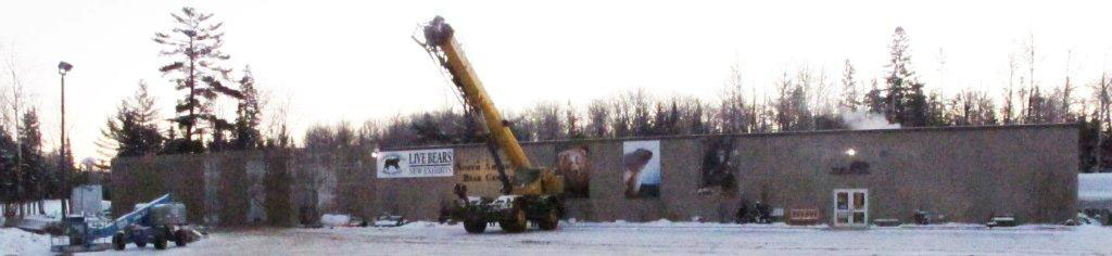 Die Außenansicht zeigt eine der letzten 8‘ x 20‘ Abschnitte von Betonwänden, die von einem großen Kran aufgestellt werden. Der Hersteller, Fabcon (aus Savage MN) ist die gleiche Firma, die auch die Wände des derzeitigen Bären Zentrums hergestellt hat. Der Finanzvorstand sandte uns heute Glückwünsche und eine Dankesmail. Er ist ein unterstützender Anwohner in seiner Sommerresidenz in unserem Forschungsgebiet, so geht der Dank in beide Richtungen.