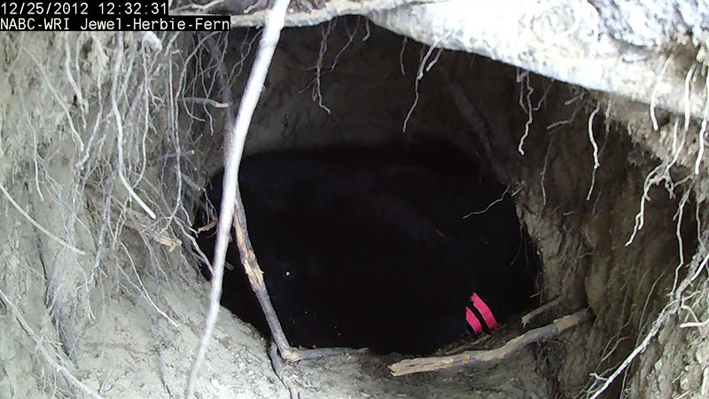 Die Lily- und Jewel Höhlenkameras sind installiert und betriebsbereit, aber ist noch nicht online. Jewels wird online gehen sobald die neuen Codes auf der Webseite hinzugefügt sind. Lilys wird etwas länger brauchen. Lily war aufmerksam und neugierig was wir da machen. Jewel, Fern und Herbie waren mehr im Schlaf – tatsächlich nutzten wir eine Taschenlampe um zu sehen, ob sie überhaupt in der Höhle seien. Wir freuen uns SEHR über die neuen HD Bilder der neuen Kameras. Wir nahmen eine Bildschirmdarstellung von Jewels Höhle auf um sie mit Ihnen zu teilen. Eine neue Saison des Lernens kann beginnen.