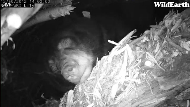 Wir warten darauf, dass WildEarth TV die Konfiguration an ihrem Ende vervollständigt und uns die eingegliederten Codes schickt, die wir brauchen um die Höhlenkameras online stellen zu können. Wir planen diesen Sonntag beide Höhlen zu besuchen um geringe Änderungen vorzunehmen. Wie man auf dem Bild sehen kann, ist Lilys Höhlenkamera auf helle Unterlage ausgerichtet was den Rest der Höhle in Dunkelheit hüllt. Wir werden versuchen es etwas mehr nach oben und nach rechts zu richten. Jewels betreffend möchten wir die helle Wurzel, die direkt vor der Kamera hängt, entfernen. Dann werden wir Jewels Kamera mehr hinein zoomen.