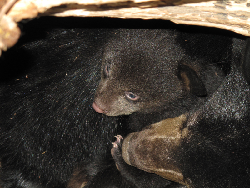 Wir sehen die Jungen nicht oft, wenn sie sehr jung sind, besonders nicht an kalten Tagen wie heute, wo es mit minus 24F (= -31°C) anfing und jetzt minus 17F (= -27°C) hat. Aber ein Rehabber, der eine Bärenmutter mit ihrem Neugeborenen beobachtet, der hat. Die Mutter ist in der meisten Zeit des Jahres ein freiherumlaufender Bär. Sie hat ein einziges Junges am 4. Januar auf die Welt gebracht. Er schickte am 27. Januar das Bild von ihrem Jungen und erzählte die Geschichte, wie er dazu gekommen ist. Im Vergleicht, Juliets Junge sind 4 Tage alt.