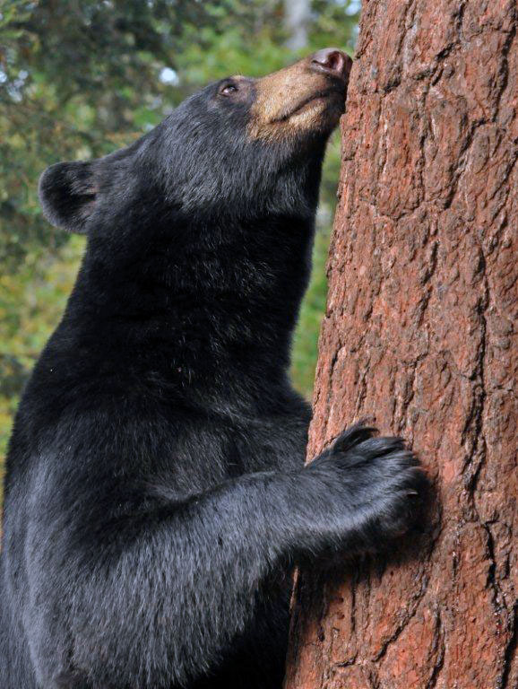Nächstes trafen wir zufällig den zweijährigen Bill und konnten ein Bild von ihm machen mit seinem völlig neuen glatten Fell das glänzte während er eine Weiße Kiefer untersuchte auf die andere Bären geklettert waren.