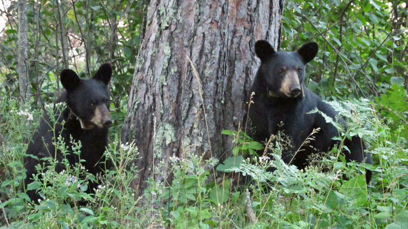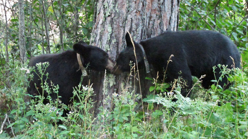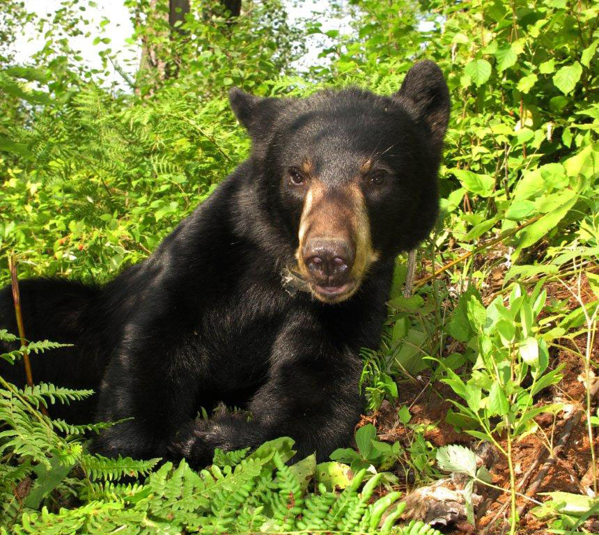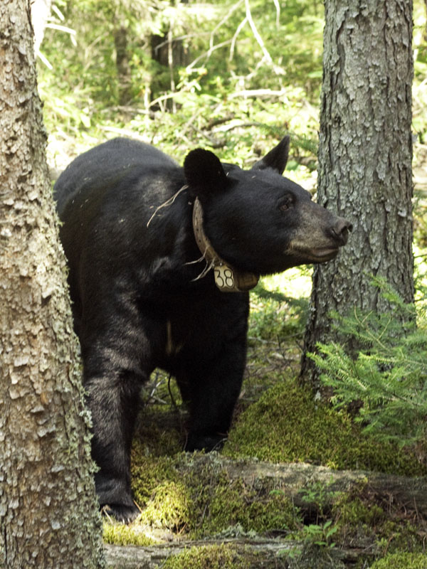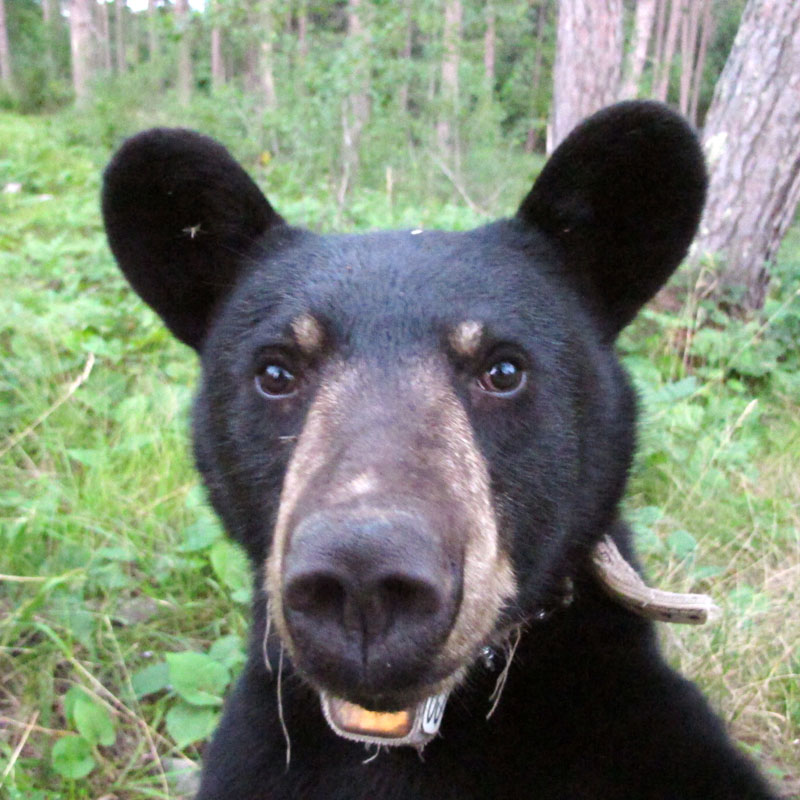 Die Jungen waren natürlich sehr niedlich, doch der Bär der die Herzen eroberte, war die ruhige, sanfte Lily. Von der Ferne beobachtend, bemerkten die Teilnehmer immer wieder, wie schön Lilys Augen seien. Wir trafen auf Lily, als sie in einem dichten Thuja/Erlen (Thuja occidentalis/Alnus rugosa) Sumpf ruhte (Herzschlag 80/Minute).Ihre Augen, ihre Mimik und ihre Reaktionen zeigten das ruhige Vertrauen, als Lynn ihre GPS Batterien auswechselte damit der Sender alle 10 Minuten ihre Ortung auf unsere Computer sendet.