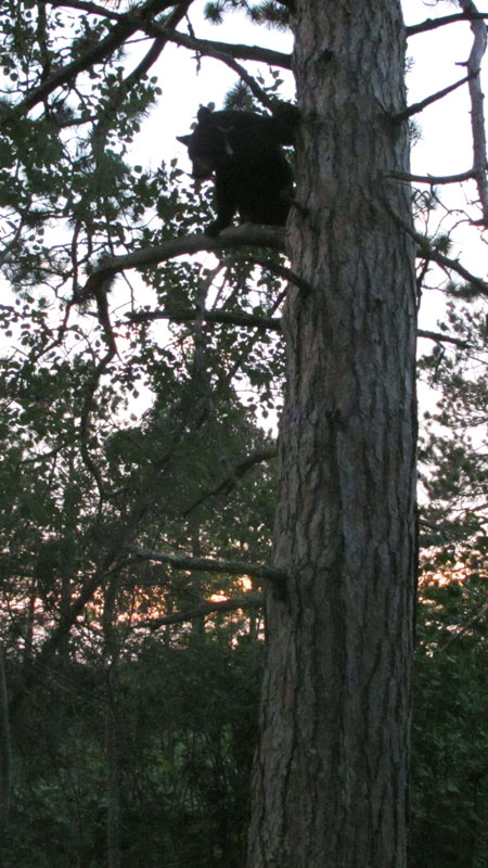 Heute Abend haben wir Oliana unmittelbar vor Sonnenuntergangmit Funk geortet um ihr ihre Antibiotika zu geben. Sie saß ganz ruhig in einer Roten Kiefer und beobachtete wie wir näher kamen. Während sie herunterkam schnaubte sie, doch war sie entspannt wie üblich als sie näher kam. Als die Kondensmilch/Antibiotika Mischung aufgespeist war, verstreuten wir ein paar Nüsse auf dem Boden in der Hoffnung einen guten Blick auf ihre Wunde werfen zu können, während sie die fraß. Sie hatte gerade angefangen zu fressen, als sie in Alarmbereitschaft versetzt wurde zur Roten Kiefer flüchtete und hinaufkletterte. Ein anderer Bär mit Halsband kam. Ohne GPS Gerät. Musste ein anderer Jährling sein. Aster.