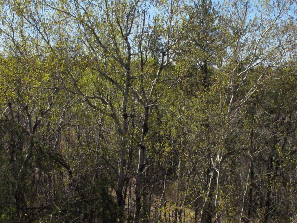 beginnen zu blühen und an vielen Sträuchern kommen kleine Blätter. Ostamerikanische Lärchen (Larix laricina) schimmern grün. Einige Amerikanische Zitterpappeln (Populus tremuloides) sind ziemlich weit mit Blättern, während andere noch gar nicht angefangen haben.