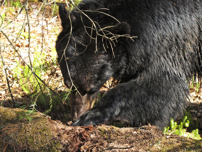 Wir gingen los, um nachzuschauen. Als das Telemetrie Signal kräftiger wurde, begannen wir „Ich bin’s, Bär“ aber sie waren auf einem Bergrücken einige Hundert Yards vom Highway entfernt und könnten uns, wegen des Verkehrs, nicht gehört haben. Wir wanderten entlang einem Waldweg der voll von blühenden Walderdbeeren (Fragaria vesca) war, die sich im warmen Regen der letzten Nacht geöffnet hatten. Als wir um eine Biegung kamen, war da die Familie, die Baumstämme nach Maden untersuchte. Sie rannten davon. Wir riefen nach ihnen, doch ein Lastwagen fuhr vorbei. Sie verschwanden im Wald.