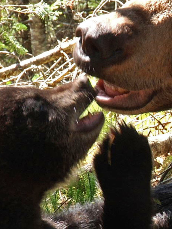 Wir haben einige guten Geschichten von mitternächtlichen Begebenheiten, die furchterschreckend klingen, doch Tatsache ist, dass wir niemals von einem erwachsenen Männchen verletzt wurden. Wir haben festgestellt, dass diese mächtigen Tier zu den schüchternsten Bären gehören es sei denn sie kennen uns. Dann sind sie unter den ruhigsten und vertrauensvollsten Bären.