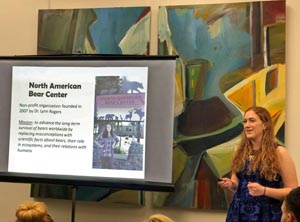 Am Mittwoch waren wir stolz auf unsere Praktikantin Kelly Mickael. Ich erinnere mich ganz genau an sie, als sie mit Donna so gewissenhaft mit den Schmetterlingen in der Ökologie Halle gearbeitet hat. Die Leute sagen viele nette Dinge über sie. Sie gab in Iowa eine Präsentation und Praktikanten Koordinatorin/Direktorin der Bildung Judy Thon ist dafür hinuntergefahren und machte dieses Bild. Judy sucht ab morgen nach Praktikanten und Ausbilder über Bären für das nächste Jahr und schrieb die folgenden Worte: