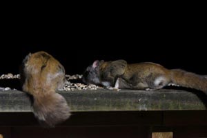 Vor dem Fenster teilten sich nach Anbruch der Dunkelheit Flughörnchen Sonnenblumenkerne auf dem Geländer friedlicher als die Roten Eichhörnchen das machen. Diese zwei Flughörnchen fühlten sich wohl so nah beieinander. Sie schienen sich gar nicht zu bemerken. Rote Eichhörnchen würden sich aufsetzen und sich gegenseitig herausfordern, selbst wenn sie weiter auseinander wären. Eine große Windböe ließ diese zwei Flughörnchen zu einem Baum rennen. Ich habe ein Eichhörnchen hinzugefügt, damit Sie den Unterschied in ihren Gesichtern sehen.
