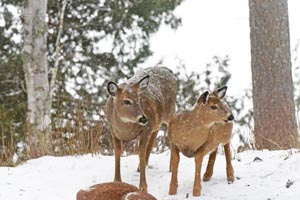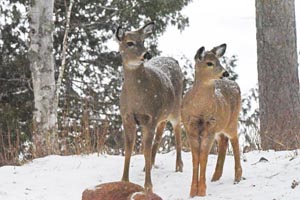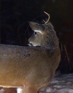 Vor dem Fenster wurden eine Ricke und ein Kitz, die bei einem Block von Dattelmash standen wachsam. Was kam? Dann duckten sie sich (besonders das Kitz) mit gebogenen Vorderknien bereit zu springen und davonzurennen. Plötzlich teilten sie sich und rannten (Bild ist zu unklar bei dem abnehmenden Licht), während der Bock mit dem gebrochenen Geweih ins Bild kam und eines von ihnen vielleicht 30 Fuß lang verfolgte. Das ist der Bock, den ich im November erwähnt habe, der auf ein junges Reh losging unter Gebrauch seines Geweihs an ihrem Brustkorb. Die Rehe heute kannten diesen kleinen Bock und waren verängstigt. Ich denke er ist berüchtigt dafür, dass er sein Geweih benutzt, um an Fressen zu kommen oder was auch immer. Ich habe noch nie solche Warnsignale bei Rehen gegenüber einem ankommenden Geschlechtsgenossen erlebt.