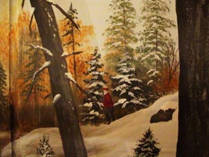 wenn jemand hereinkommt durch die Tür oder die Northwoods Ökologie Halle betritt. Ich mag ihre Arbeit und die Art wie sie Bärenjunge porträtiert. Alles was ich sagen kann ist Danke dafür, dass sie ihr Herz da hineingelegt hat. Als zusätzliches Extra versteckte sie in der Mauer der Ökologie Halle ein 4 Inch großes Bild von mir mit meiner roten Jacke im Schnee wandernd. Sie müssen genau hinschauen, um es zu finden.