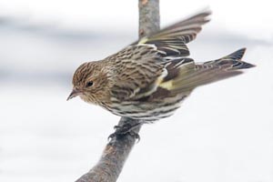 Vor dem Fenster hatte es über null Grad F, doch der Wind ließ es kälter erscheinen. Fichtenzeisige sind schlank und stromlinienförmig wenn sie fliegen, fliegen ihre Federn für zusätzliche Isolierung wenn sie sitzen. Der Wind blies den neuen Schnee von Teilen des Hofes und erlaubte es so den Rehen an Gras zu knabbern.