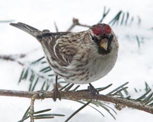 Ein neuer Vogel gesellte sich heute unter die Fichtenzeisige. (Bild oben). Es ist ein Birkenzeisig (Acanthus flammea). Er sieht ähnlich wie ein Zeisig aus, hat aber kein Gelb und weniger Streifen auf der Unterseite und er hat eine rote Kappe. Die Männchen werden im Frühjahr wunderhübsch werden in ihrem Hochzeitsgefieder, wenn sie ihre rosa Brüste haben. Sie sind über den Sommer im nördlichen Kanada und Alaska ungefähr 500 bis 1600 Meilen von hier entfernt.