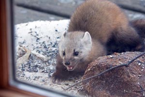 Frau Baummarder war auf dem Dach des Vogelfutterhäuschens und fraß Dattelmash, als Herr Baummarder vor meinem Fenster erschien. Ein Stückchen Dattelmash war dort, aber er rannte hin und her, schaute in alle Richtungen nach Eichhörnchen. Er stand auf und zeigte, wie viel größer und blonder als sie er war. Er hüpfte hoch um Frau Baummarder besser sehen zu können, bevor er sich mutig zu ihr gesellte. Sie zeigte wenig Aufmerksamkeit. Fraß weiter. Er rannte das Deck entlang, blieb hier und da stehen um nach Eichhörnchen zu schauen. Er kletterte auf einen Baum, während ich von Fenster zu Fenster rannte. Dann rannte er die Treppen hoch bis zum dritten Stock Deck. Ich rannte die Innentreppen hinauf um zu sehen, was er tun würde, dachte er würde in eine der leeren Abfalleimer gehen, die dort auf der Seite lag. Frau Baummarder kam die Treppen hochgerannt, ihm nach und die beiden verschwanden zusammen im Abfalleimer. Sie kam mehrmals heraus und ging wieder hinein. Als sie über den Rand des Decks schaute, achtete sie nicht darauf als Herr Baummarder herauskam und eine Pfote auf ihre Hüfte legte, sie festhielt und sein Gesicht mit geschlossenen Augen an ihre Seite schmiegte. Es ist keine Paarungszeit. Die ist im Sommer wobei die Embryonen bis zum Spätwinter eingelegt werden. Wenn Frau Baummarder drei Jahre alt oder so ist, könnte sie in den nächsten paar Wochen gebären.