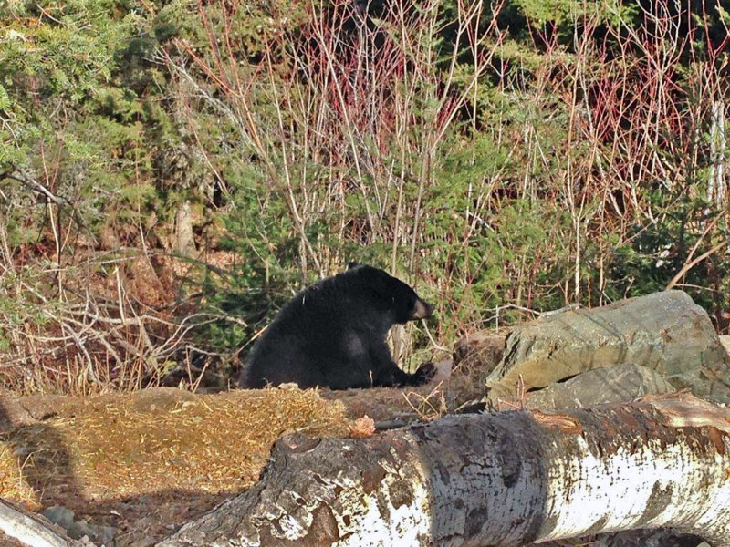 Wir haben heute Teds Muskel angeschaut, die Schwellung ist weiter zurückgegangen. Er ist sofort aufgestanden und zum Zaun gekommen, um uns seine herzliche Begrüßung zukommen zu lassen. Lynn ging hinein und streichelte seinen Rücken, während er ihm Erdnüsse gab – langes festes Streichen vom Hals bis zum Hinterteil lässt einige Bären ihren Rücken vergnüglich strecken. Wenn wir den Bären Senderhalsbänder umgelegt haben oder ihre Batterien gewechselt, gaben wir ihnen oft einige von diesen Streicheleinheiten. Inzwischen hat Heidi Honey unten an der Fensterhöhle gefüttert und Lucky (mit seinen nördlichen Wisconsin Genen)begnügte sich, wie es für ihn üblich ist, in seiner Höhle zu bleiben um diese Jahreszeit. Was für einen Haufen Stroh er hat.