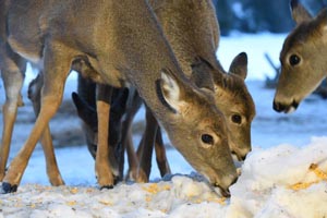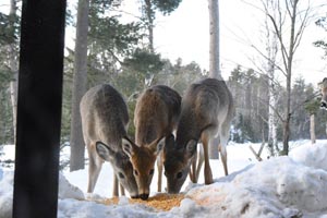 Vor dem Fenster habe ich den Mais ausgeschüttet, wo er nicht in den neuen Schnee sinken würde. Dann sahen mich die Rehe mit der Kamera hinter dem Fenster gestern Abend und heute und waren nicht sicher, was sie davon halten sollte. Eine Familie fraß friedlich zusammen. Später am Tag kam, ich denke es war der mit dem ehemals gebrochenen Geweih, alleine.