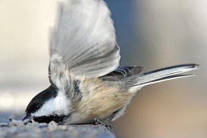 Vor dem Fenster zeigte eine Meise ihre Art sich im Flug Futter für Abendessen zu holen.