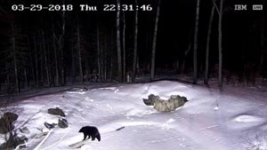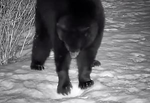 Unsere Judy McClure hatte wohl einen der ersten Bären um Ely. Sie hat ihn nicht gesehen, aber teilweise Spuren im harten Schnee und die Tatsache, dass kein anderes Tier um Ely das ihrer Futterkrippe hätte antun können, was auf dem Bild, das sie uns schickte, zu sehen ist. Er kippte die Futterkrippe um und den halben Baumstamm auf den Boden. Es wird nicht mehr lange dauern, bis wir Bären sehen.