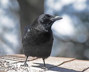 Das Helmspecht Weibchen hat mich oft genug an meinem Schreibtisch gesehen, um keine Angst zu haben und ihren Talg zu zerkleinern. Helmspechte sind ungefähr so lang wie die Krähen aber schlanker. Im National Geographic Führer steht als Länge für einen Helmspecht 16 ½ Inches und dem einer Amerikanischen Krähe 17 ½ Inches.