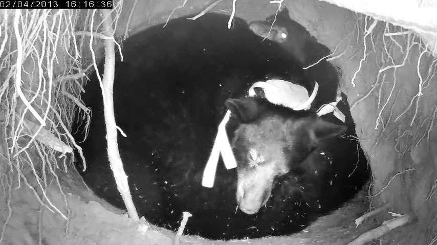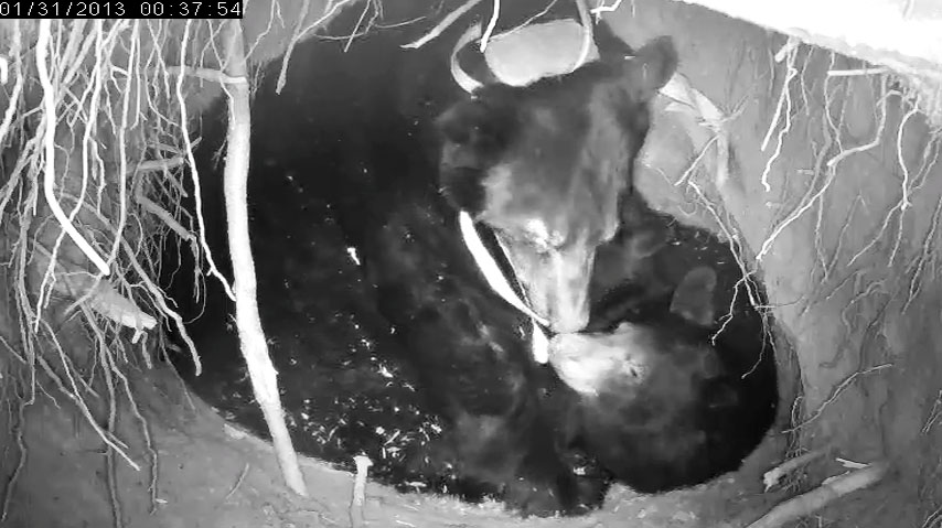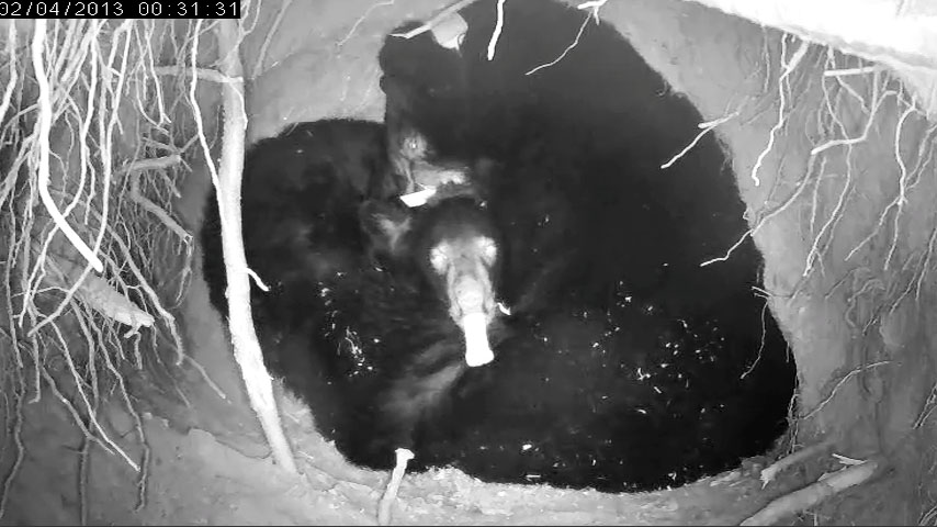 Bären überwintern alleine, es sei denn Junge sind vorhanden. Es können bis zu vier Bären in einer Höhle sein, wenn die Bärenmutter im vergangenen Januar drei Junge geboren hatte! Wenn der Bär alleine ist, ist es sehr ruhig in einer Bären-Höhle. Es ist SEHR laut in der Höhle, wenn Babys im Januar geboren werden! Dann, wenn die Jungen älter werden, fangen sie an miteinander zu spielen und ihre unmittelbare Umgebung zu erkunden.