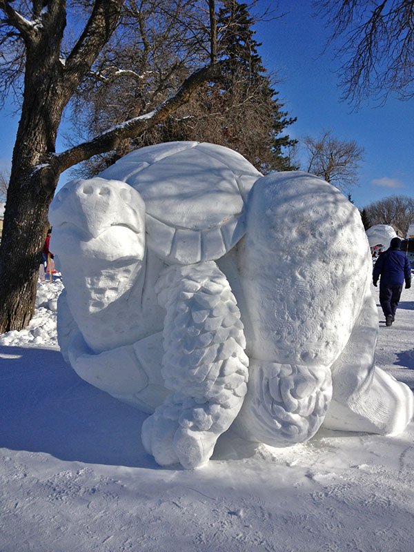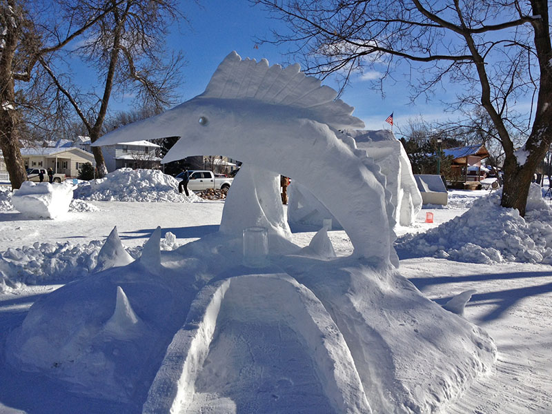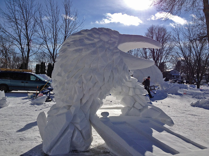 Die Schneeskulpturen sind bei weitem der sichtbarste Teil des Winterfestes und der beliebteste. In der Nacht konkurrieren sie jedoch mit der Aufmerksamkeit für die „Eis Kerzen“. Volontäre schaffen mit viel Geduld „Schornsteine“ aus Eis indem sie teilweise Wasser in 5-Gallonen-Einern gefrieren lassen und das dann ungefrorenes Wasser aus dem Eimer aus der Mitte darüber fließen lassen. Man stecke eine Kerze hinein und schon hat man eine Eiskerze. Beachten Sie die Eiskerze unter dem Speerfisch.