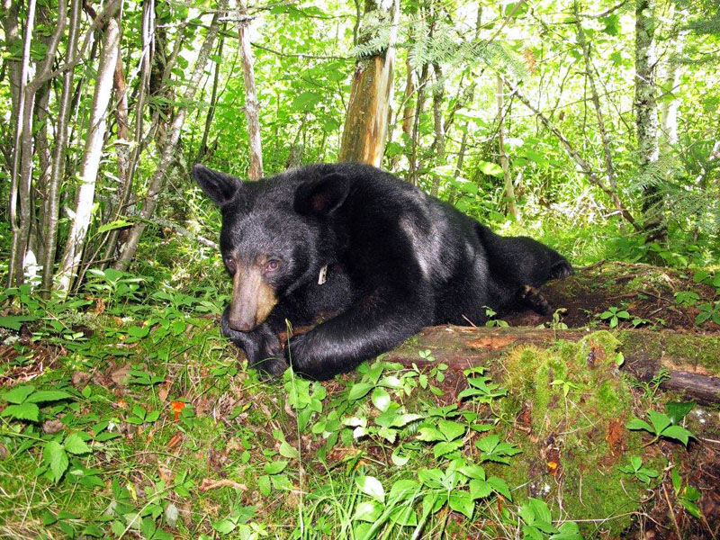 Mittags fanden wir Lily in einem Sumpf aus Zedernholz ruhend, in der Nähe einer Rohrkolben-Futterstelle. Bären fressen die weichen fleischigen Stängel der Rohrkolben. Sie zeigte uns ihr schönes Gesicht und Augen während sie kurz an einem Baumstamm posierte.