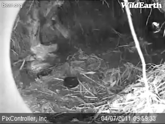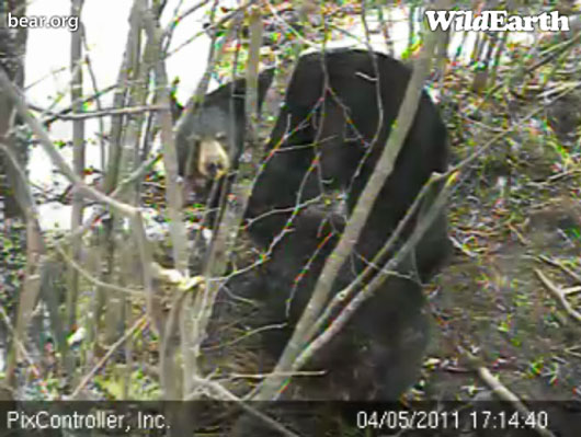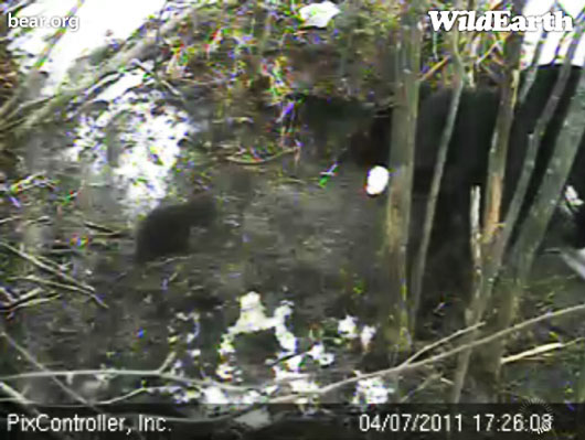 Hope verbringt Zeiten in denen sie träge alleine spielt während sie Lily im Auge behält. Sie lässt Lily nicht weit weg ohne ihr nachzueilen. Im Moment spielen die Kleinen zusammen an ihrem vorübergehenden Schlafplatz. Sie scheinen zufriedener als sonst zu sein was uns denken lässt, dass Lily immer noch, dreieinhalb Wochen vor dem Grünen und Futter viel Milch produziert. Wir denken, dass Anfang Mai die jungen Blätter aus dem Waldboden sprießen werden. Lily scheint sich von alter Vegetation in den wenigen schneefreien Plätzen zu ernähren. Wir wissen nicht, was sie findet, so wird es interessant sein ihre Hinterlassenschaften um den Schlafplatz herum oder in der Latrine die sie uns vorher gezeigt haben, zu untersuchen.