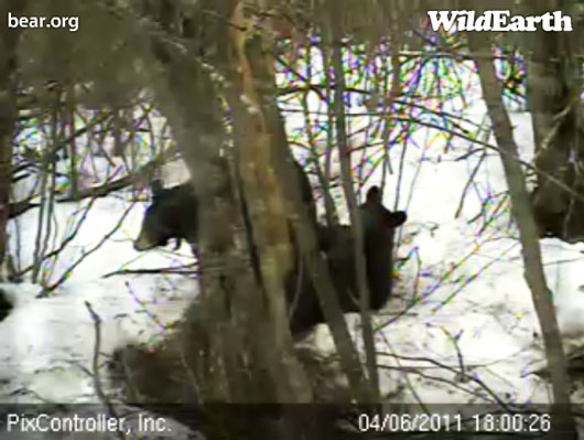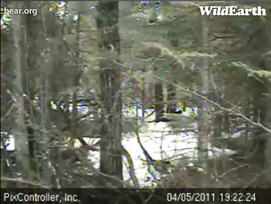 Gerade als wir das um 19:40 h posten wollten sahen wir hungrige weinende Junge weg vom Schlafplatz, schön einen Baum herunterkletternd um Lily und Hope in die Entfernung zu folgen. Unser erster guter Blick auf beide Junge seit sie von der Höhle weg sind und so eine nette Silhouette gegen den Schnee. Beide Junge laufen so gut und Jason schien die Führung zu haben – und wahrscheinlich der war, der schrie. Als wir dieses Update beendeten sind sie zurück an ihrem Schlafplatz. Doch für wie lange?
