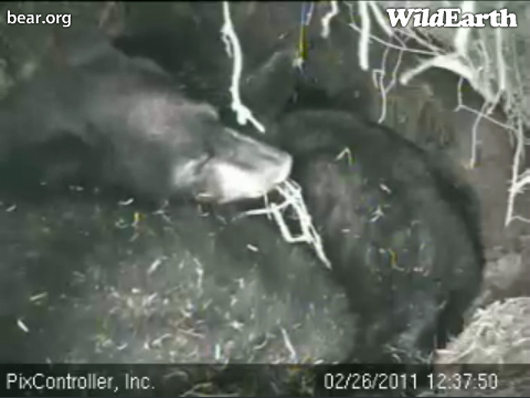 Es war ein ziemlich ruhiger Tag in der Höhle. Lily hatte meinst ihren Rücken zur Kamera. Dann, ungefähr um 14 h, änderte sie ihre Position um Schnee zu fressen. Hope griff sich ein Junges um mit ihm zu spielen und wir fingen etwas Videomaterial ein: