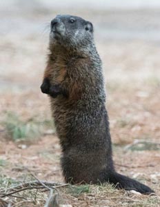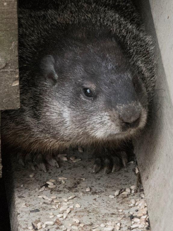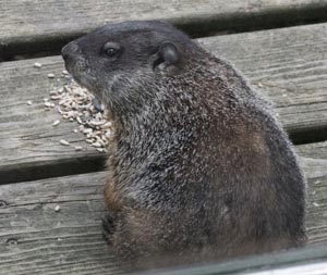 Das Waldmurmeltier war heute wieder auf dem Deck des zweiten Stocks. Wir nehmen an, dass er Sonnenblumenkerne mögen würde, so öffneten wir leise die Tür und schütteten einen Haufen hinaus. Auf seinem Weg daran vorbei, als er wegging, machte das Waldmurmeltier Halt um zu fressen. Es sah mich durchs Fenster, als ich nach der Kamera griff, aber es fraß weiter. Später auf dem Boden stand es auf. Irgendetwas hatte es erschreckt und es rannte zum Erkerfenster. Ich machte eine Aufnahme und es tauchte in seinen Bau unter diesem Fenster. Wir hören es unter dem Fenstersitz. Wir warten darauf seine Jungen zu hören (oder nicht) damit wir wissen ob wir es Frau oder Herrn Waldmurmeltier nennen sollen.