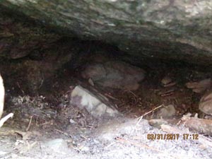 An Tashas Höhle ankommend, war der Schnee bei Temperaturen in den 50-igern geschmolzen, aber die Kruste war so hart und nach dem frühen Wäremeeinbruch, der von kaltem Wetter gefolgt wurde, dass ich noch auf ihr laufen konnte. Ich sah keine Spuren von ihr. Ich machte einige Bilder von der Höhle von außen und innen. Das Innere sah mit dem Gestein darin nicht so gemütlich aus, doch das war es, was sie gewollt hatte. Am späteren Nachmittag machte ein Lily Fan dieses 10 Minuten VIDEO von ihr in Bewegung. Ich fragte Sharon wo sie dachte, dass Tasha sich hingelegt hat und sie meinte, dass das wahrscheinlich in der Richtung sei, die Tasha gestern in den Wald gegangen sei.