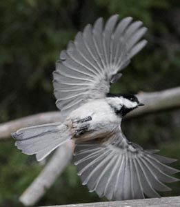 Ein Purpurgimpel flog auf, unmittelbar als ich aus dem Fenster fotografierte, was mir ein Bild im Flug gab. Ich sah, wie der Baummarder in Richtung Treppe zum zweiten Stock Deck kam und ließ ihn anfangen die Treppen hinaufzugehen.