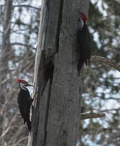 Für eine kleine Aufregung sorgten vor ein paar Tagen (04. April) das Helmspecht Männchen und Weibchen, die zusammen das alte Nest untersuchten. Ich denke das Weibchen ging in die Nisthöhle hinein. Als das Männchen wegflog, war sie nicht zu sehen. Einige Sekunden später flog sie vom Baum weg, was mich auf den Gedanken brachte, dass sie in der Nisthöhle gewesen war. Helmspechtpaare brüteten dort 2006, 2007, 2009 und 2014.