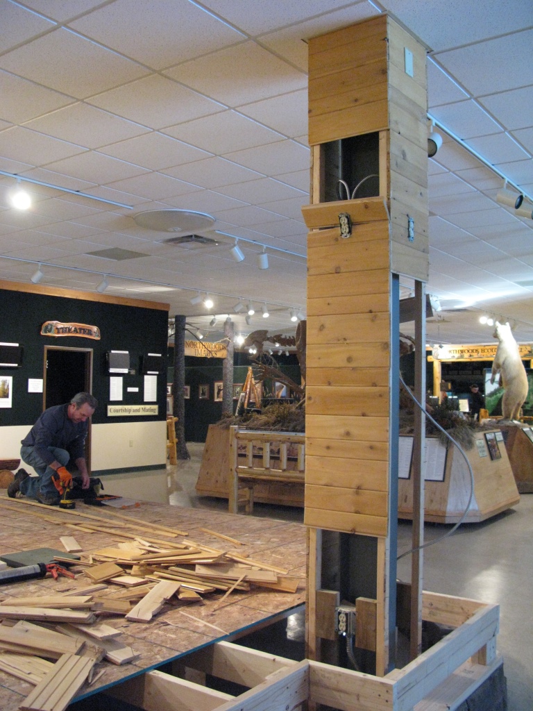 Am Bären Zentrum ist ein Fortschritt bei der Renovierung zu sehen. Bei der „Camping mit Schwarzbären“ Ausstellung wurde das Holz um den Pfosten entfernt, als Schritt um den Pfosten in eine Weymouthkiefer zu verwandeln mit einem Ast von dem ein Rucksack hängt.
