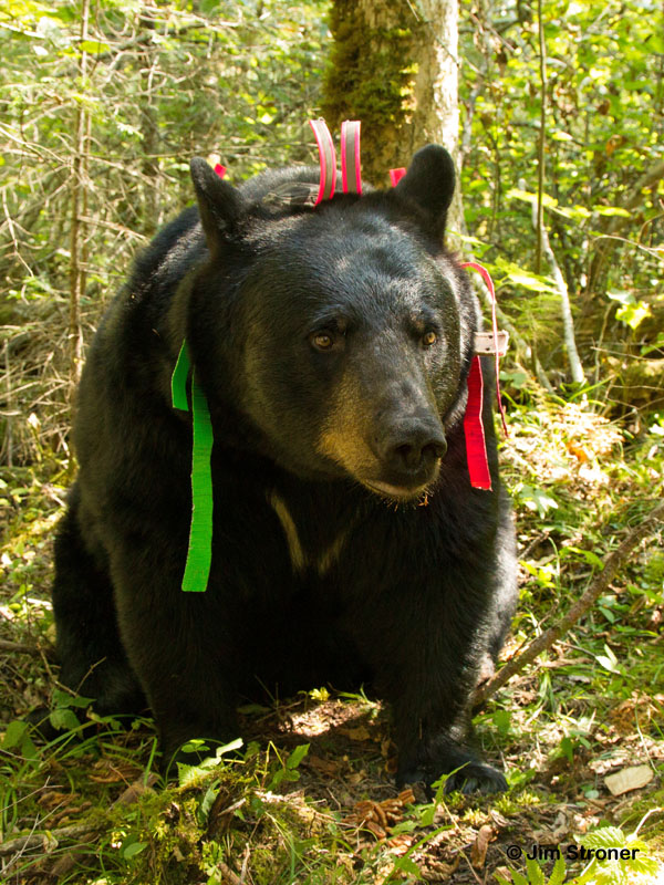 Heute lokalisierten wir Bären, wechselten GPS Batterien und richteten umgedrehte Halsbänder richtig, um die Bären wieder „auf die Karte“ zu bekommen. Wir nahmen uns zuerst Braveheart vor. Wir wussten, dass ihre Batterien immer noch gut sein sollten, so nahmen wir an, dass ihr GPS unter dem Kinn statt oben auf ihren Hals, wo es am besten arbeitet, war. Wir lokalisierten sie in einem Zedern/Erlensumpf und fanden, dass sie nicht der lethargische Bär wie vor ein paar Tagen war. Sie war unterwegs und hungrig. Wir gaben ihr einige Nüsse, drehten ihr Halsband herum und prüften ihr GPS. Sobald die Nüsse aufgefressen waren, ging sie rückwärts von uns weg (die Erlen waren zu dicht um sich herumzudrehen) und lief davon.