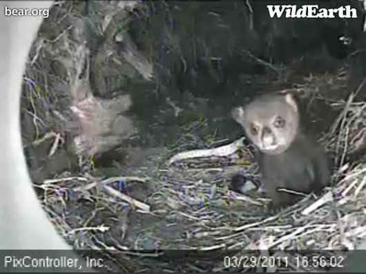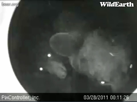 Gestern Nachmittag fiel die äußere Schwenkkamera (PTZ) aus als ‘jemand’ sich durch das Kabel gefressen hat. So war natürlich, als das Drama gestern Nacht stattfand, viel Angst unter denen von uns, die zwar hören konnten, aber nicht sehen was da los war! Die Bären haben alle die Höhle verlassen. Als Faith aufgeregt war schrie sie laut unmittelbar außerhalb der Höhle – doch dann verblasste ihre Stimme in der Ferne. Die Außenkamera war ausgefallen so konnte niemand sehen warum ihr Schreiben so klang als würde sie schnell weggetragen. Und wenn sie weggetragen wurde --- wer oder was trug sie? Schließlich kamen drei Bären zur Höhle zurück. Lily stillte Hope und Jason – Hope mit ihrem tiefklingenden Summen und Jason mit höherem Summen – aber nicht Faith. Wir bemühten uns eine dritte Stimme zu hören, konnten aber keine hören. Irgendwann später, nach viel Verwirrung und einigen Ausflügen in und aus der Höhle, kam Faith kleine Stimme zu Jasons kleiner Stimme dazu und wir alle atmeten erleichtert auf. Die Bären verstehen es uns in Spannung zu halten.