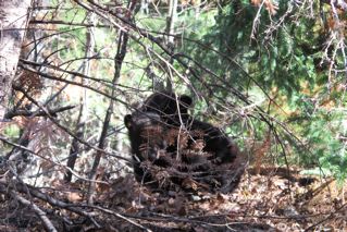 Dann überprüften wir Junes alte Höhle, wo June, Aster und Aspen die letzten paar Tage mit Futtersuche verbracht haben. Wir fragten uns, ob sie an ihrer alten Höhle waren, zu dieser Jahreszeit, wo die Bären normalerweise immer noch in ihren Höhlen im Schnee sind. Ja, das waren sie. Aus irgendeinem Grund kratzten sie das alte ‚Bettzeug‘ vom letzten Jahr heraus. Aster ging, während wir dort waren, in die Höhle. Könnte das Herauskratzen des alten ‚Bettzeugs‘ bedeuten, da0 sie planen diese Höhle in der Zukunft wieder zu benützen?