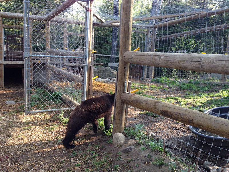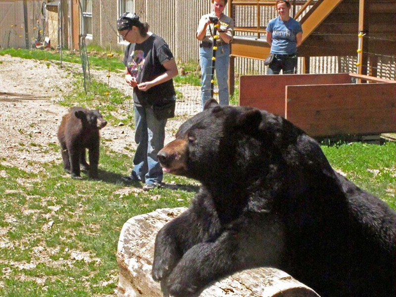 Eine weitere große Anstrengung verlief nicht so gut. Zu Beginn des Frühjahres erfuhren wir, das ein männlicher Schwarzbär Jährling in Wisconsin eingeschläfert werden sollte, wenn keine passende Institution gewillt wäre, ihn zu übernehmen. Uns wurde gesagt, dass er so einen lieben Charakter hätte, als die Beamten ihn aus einem Haus beschlagnahmten, nahm ein Beamter ihn einfach auf den Arm und trug ihn hinaus zum Auto. Lily Fans besuchten ihn und berichteten, dass er ein Schatz ist. Wir boten ihm ein dauerhaftes Zuhause an am Nord Amerikanischen Bären Zentrum. Wir hatten gehört, wie sehr gerne Holly mit anderen Bären spielte und dachten, dass ein Bär in ihrem Alter ideal wäre. Wir sahen ihre Energie als sie in den letzten Wochen in ihrem Gehege herumtobte, weil sie von den anderen Bären getrennt sein musste, wegen ihrer Parasiten. Wir sahen Bilder von dem kleinen Männchen mit der großen weißen Fliege auf seiner Brust und dem Namen Bo. Ein Lily Fan hat sich freiwillig gemeldet ihn zum Bären Zentrum zu transportieren. Wir bestellten neues Material um ein neues Gehege wie das von Honey zu bauen. Bären Pädagogen halfen dabei.