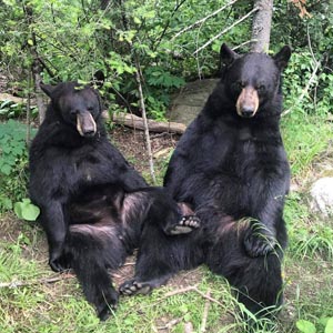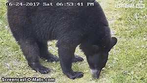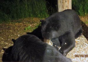 Shadow hat einen Freund und sie sind so süß zusammen. Das Paar wurde gestern Abend gegen 20 h entdeckt. Sie zeigten sich als Nachteulen, als sie hier um 23 h erschienen und von einer anderen Nachteule, Peggy, aus dem Fenster fotografiert wurden (Shadow, im Vordergrund, versteckt ihr graues Gesicht vor der Kamera). Peggy meinte, dass sie sich, Nase an Nase eine Schüssel Erdnüsse teilten, manchmal zärtlich aneinander knabberten. Für mich ist es doppelt interessant, da niemand weiß warum weibliche Schwarzbären mit 26 Jahren, in Shadows Fall mit 28, aufhören Junge zu produzieren). Das Interesse des Männchens weist darauf hin, dass Shadow rossig ist, was bedeuten könnte, dass Shadow einfach ein extra Jahr braucht, um sich von ihrem letzten Wurf zu erholen und dabei ist, einen neuen Rekord eines Schwarzbär Weibchens das einen Wurf im Alter von 31 produziert, zu setzen. Wir warten darauf ob sie nächstes Frühjahr einen neuen Wurf haben wird.