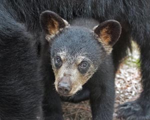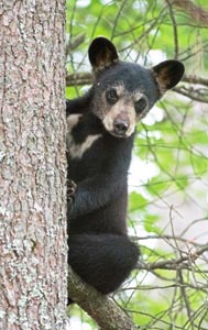 Der Tag begann mit einem Telefonanruf. Lily und ihre Jungen waren gesehen worden. Ich eilte zu dem Ort und fuhr in die Einfahrt. Lily hörte meinen Van. Sie kam an bis sie sah, dass ich nicht zu fressen dabei hatte. Dann hatte sie Besseres zu tun. Sie ist so eine wundervolle aufmerksame Mutter. Sie beobachtet die ganze Zeit ihre Jungen, was wichtiger als Nahrungssuche ist. Das männliche Junge mit dem großen Hufeisen auf seiner Brust ist der ruhigste, bleibt am nächsten bei Lily und posiert für die meisten Bilder. Das Männchen mit dem halben Hufeisen ist der zweit zutraulichste. Das Geschlecht des dritten Jungen ist noch ein Mysterium, da es hoch oben im Baum blieb.