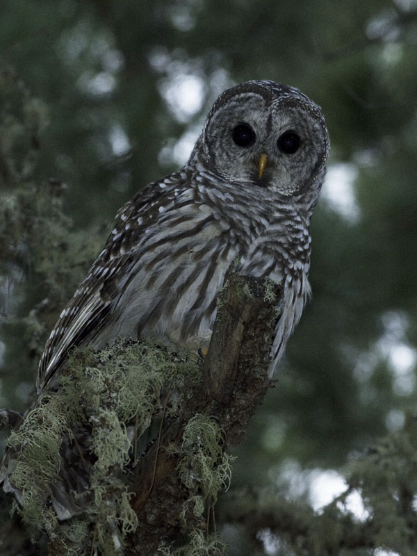 Auf dem Weg aus dem Wald in der Dämmerung, sass ein Streifenkauz (Strix varia) Modell für ein Bild während er uns beobachtete.