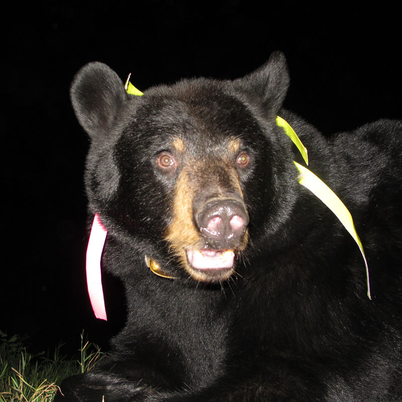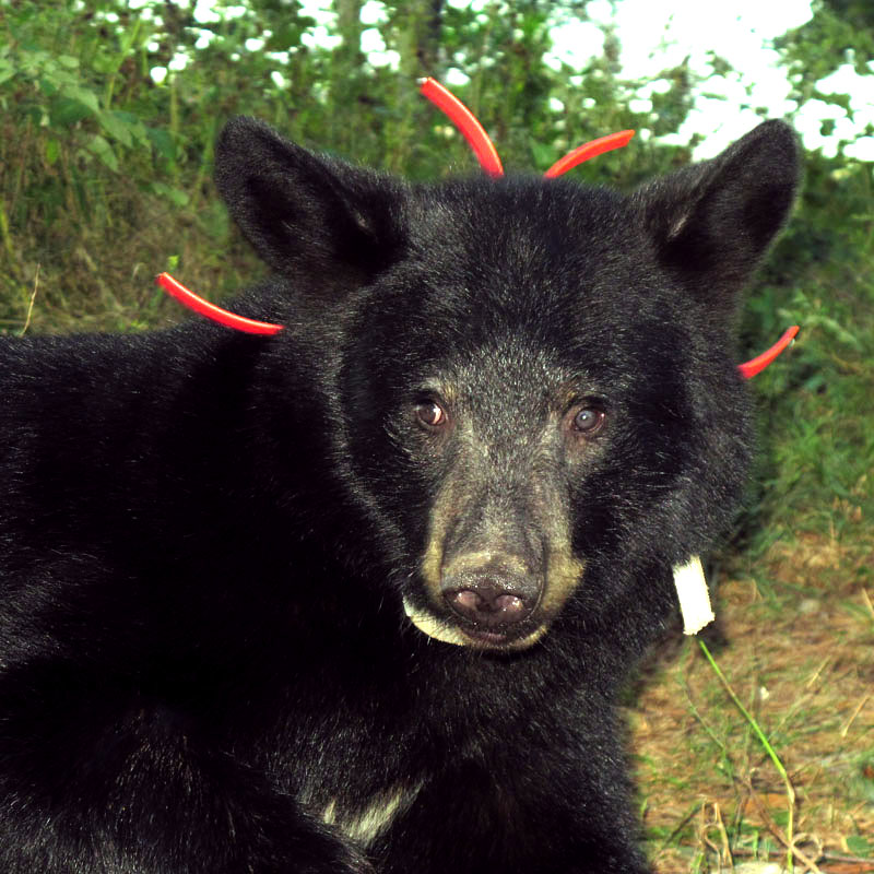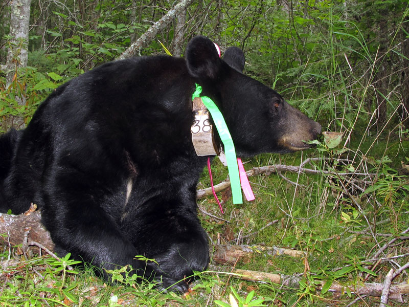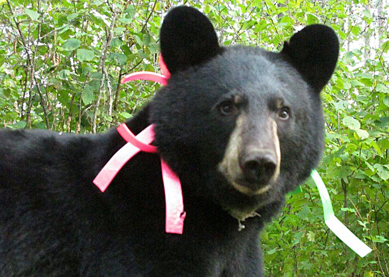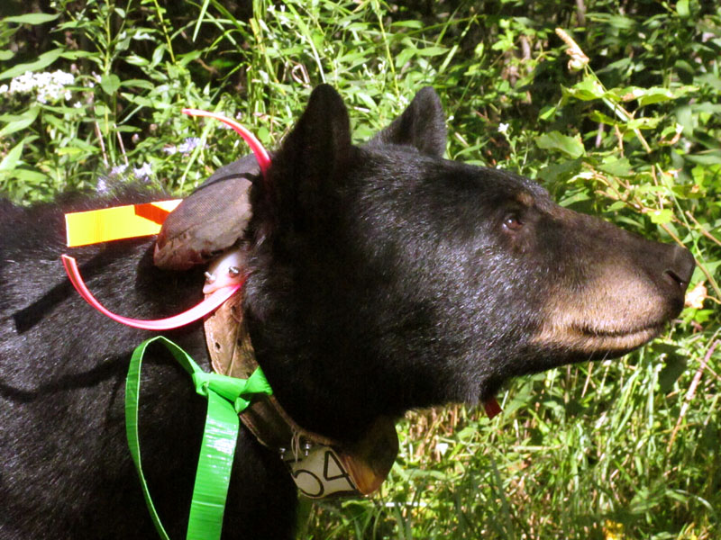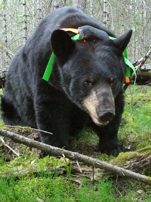 Braveheart war einfach. Sie ruhte in einem Zedernsumpf nur 100-200 Yard von einer Forststraße entfernt. Sie gähnte als Lynn sich ihr in ihrem weichen Moos Bett näherte. Braveheart (10) ist ein erfahrener Forschungsbär und sie kennt die Routine Nüsse im Austausch von Zugang zu ihrem Halsband. Als die Bänder und reflektierenden Plastikstreifen an ihrem Halsband befestigt waren und keine Nüsse mehr da waren, verschwand sie ohne einen Blick zurück im Sumpf.