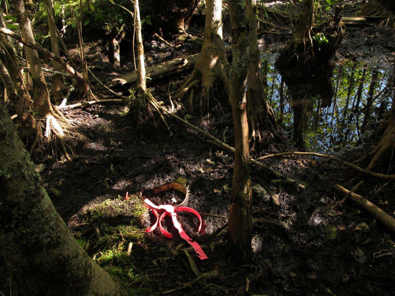 Dann entdeckten wir, dass Faith ihr Halsband verloren hatte. Faith wieder das Halsband umzulegen hatte jetzt Priorität. Wir fanden das verlorene Halsband an einer Schwarz-Esche (Fraxinus nigra) Sumpf wo das leuchtende Plastik aus dem schwarzen Matsch herausstach wie aus ihrem schwarzen Fell. Faith war immer noch in dem Gebiet und es gelang uns vor dem Ende des Tages bei ihr zu sein. Puh!