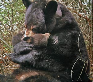Bezüglich der Lily-Hope Wiedervereinigung von vor einigen Nächten, hörten wir so viele Erklärungen für die Trennung und sahen einige in der Zeitung vom DNR, als ob jeder den Grund kennen würde, außer mir. Der DNR sprach sogar mit National Geographic Wild auf die gleiche Art und überzeugte sie alle drei Dokumentarfilme über Lily und Hope, ohne mir etwas zu sagen, auszusetzen. Sie behaupteten Lily sei zu jung gewesen und dass jeder weiß, dass junge Mütter von ihren Jungen weglaufen, weil sie noch nicht in der Lage sind, Junge großzuziehen. Sie behaupteten, dass irgendetwas mit Hope nicht gestimmt hätte, sodass Lily nicht mehr Energie in sie stecken wollte. Sie behaupteten, dass Lily wusste, dass, wenn sie ihr einziges Junges verlassen würde, sie sich wieder paaren könnte und das nächste Jahr einen größeren Wurf haben, um ihr Fortpflanzungsvermögen maximieren zu können. Sie behaupteten, dass Lily wahrscheinlich Hope töten würde, wenn sie sie wiedersähe. Wir testeten all das obige um sie wieder zusammen zu bringen. Sie haben das Ergebnis in dem Video gesehen. Was wir erlebten war, dass Lily paarungsbereit wurde und zerrissen war. Wir vermuten fest, dass nur ein Junges zu säugen (Hope) die Produktion nicht genug stimulierte um den Eisprung zu verhindern. Bären in ihrer Umgebung haben normalerweise zwei bis drei Junge pro Wurf. Wir haben erfahren, dass 82% der Weibchen in Pennsylvania ihren ersten Wurf haben, wenn sie drei (manchmal zwei) werden und es ihnen gut dabei geht. Sie laufen nicht weg.