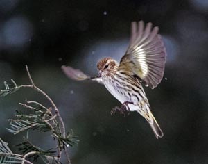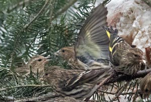 Vor dem Fenster rangelten Fichtenzeisige im Flug und auf dem Boden um gute Plätze, als sie an einem Fleck mit Sonnenblumenkernen landeten. Ich beobachtete die Unschärfe der Bewegungen als sie nach unten flatterten. Ich habe die dramatischen Wechselwirkungen, die die Kamera einfing nicht bemerkt. Auf einem Bild haben zwei Fichtenzeisige einfach eine im Flug Kollision zu vermeiden gesucht. In zwei anderen Bildern zanken Fichtenzeisige auf dem Boden. * *