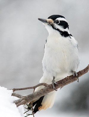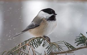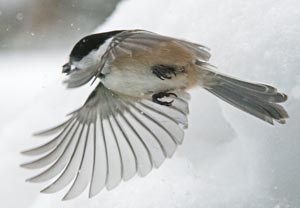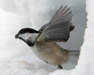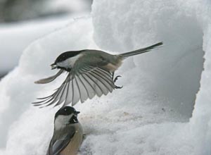 Vor dem Fenster hier am Wildtier Forschungsinstitut grub ein Rotes Eichhörnchen, während der Schnee den zerstreuten Haufen von Sonnenblumenkernen bedeckte, ein gutes Versteck unter den Schnee. Das Eichhörnchen ging weg. Schwarzkopfmeisen hatten das bemerkt, die einzige Vogelart, die das gesehen hatte. Die Samen waren von außen zu sehen. Meisen eilten zu dem Haufen und wechselten sich ab. Nur eine Meise konnte auf einmal in dem Loch sein. Einige passten von einem Tannenzweig aus auf, bis sie an der Reihe waren. Andere hockten einfach davor und warteten bis die Meise, die im Loch war, herausflog. Anderswo enthüllten Eichhörnchen ihre Haufen, die auch begehrt waren.