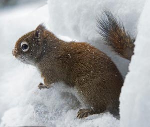Es hat viel geschneit heute, wie man in diesem 1-Minuten VIDEO von einem Roten Eichhörnchen auf Mannys Schüssel am NABC sehen kann. Das Eichhörnchen benutzte seinen Schwanz um den Rücken vot Schnee zu schützen. Ich habe vorher nie über diese Nutzung des Schwanzes eines Eichhörnchens nachgedacht.