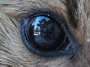 Die Spiegelung in Fräulein Baummarders Auge, zeigt, wo sie war. Schwarzbär-Feldkurs Teilnehmer werden es erkennen. Sie ist auf dem Bärenfutterplatz im zweiten Stock Deck unmittelbar vor meinem Schreibtisch Fenster – weniger als zwei Fuß vom Fenster entfernt. Der Weitwinkel in ihrem runden Auge lässt es viel weiter aussehen. Das Fenster sind 3 Panele Glas – jedes 18 Inch breit, aber sie sehen viel größer auf. Darunter sind die Doppeltüren (6 Fuß breit), die kaum zu sehen sind und nur wie ein schwarzes Loch aussehen. Darunter schauen wir die Treppen hinunter (nicht sichtbar) nach draußen auf eine große Weymouthskiefer. Darunter ist die 3-teilige Garage die in der Entfernung klein aussieht.