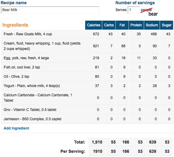 Quill leckte über Nacht 6 der 7 Tassen Milchersatz auf. Heute fanden wir heraus, wie viele Kalorien das wären. Schaut man sich die Karte unten an, sind es ungefähr 340 Kalorien pro Tasse. So wären 6 Tassen 2040 Kalorien. Quill hat bis zu 12 Tassen (4080) Milchersatz in einer Nacht aufgeschlabbert, dazu 1-2 Pfund Walnüsse, was weitere 2965 bis 5930 Kalorien bedeutet. Wir könnten auf das zurückgehen, was wir essen um zu sehen wie viele Kalorien bei ihm zu Gewichtzunahme führen. Es gibt im Wald nichts sonst für ihn zu fressen zu dieser Jahreszeit.