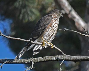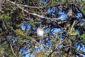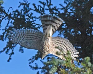 An diesem wunderschönen kühlen (48F) Tag machte ein Eckschwanzsperber Dutzende von Versuchen und Jagd auf einen Blauhäher mit vielen fast Erfolgen, aber niemals mit Erfolg. Ich habe niemals einen Jagdversuch in Hunderten von Versuchen in all den Jahren hier gesehen. Die Jagden wurden meist von Jungvögeln gemacht, genauso wie heute. Der Blauhäher wich aus und versteckte sich in den dichten Ästen einer nahegelegenen Balsamtanne wo die Blauhäher sich leicht vor Eckschwanzsperbern in Sicherheit bringen können. Einmal saß der ausgetrickste Sperber an einem nahegelegenen Ast (Foto) nachdem Tauchen (Foto) und weiteren Mißerfolg einen weiteren Blauhäher zu erwischen.